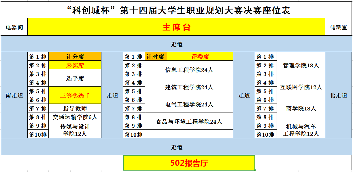 “科创城杯”第十四届Beat365唯一官方网站大学生职业规划大赛决赛将于12月4日(星期三)下午3:00在5楼报告厅举办,请各院按要求组织学生观众到现场观摩。请所有参与人员2:20—2:50入场并到指定位置就座(座位表附后)。