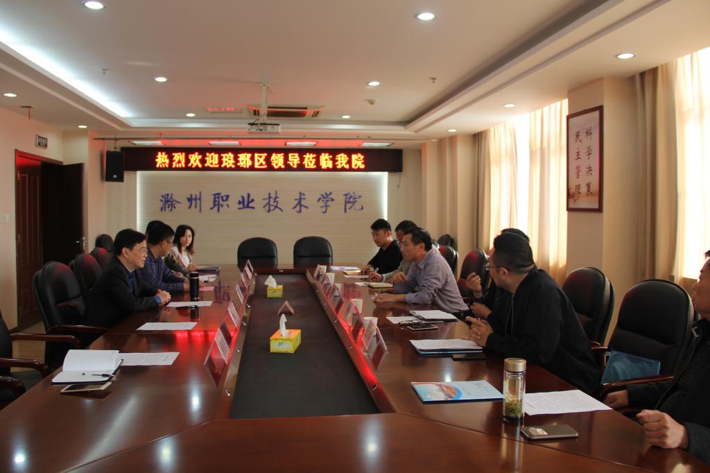 4月2日下午,琅琊区委书记余成林,琅琊区政府副区长赵洪江一行到Beat365唯一官方网站考察交流。学院党委副书记、院长李柱梁,院党委委员、院长助理、职教集团秘书长穆松出席会议,招生就业处相关同志参加了会议。