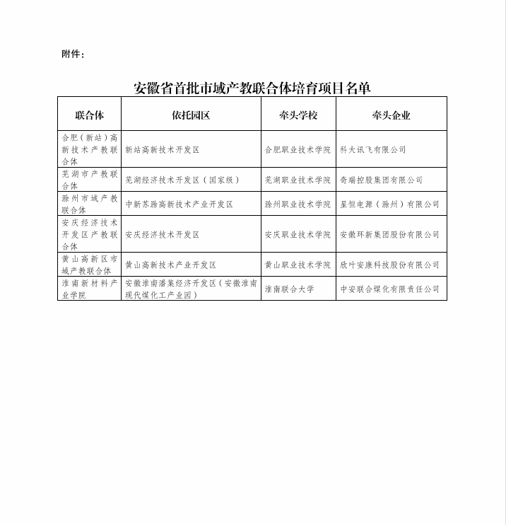 根据《教育部办公厅关于开展市域产教联合体建设的通知》《安徽省教育厅关于开展市域产教联合体培育工作的通知》精神,经各市、各有关部门推荐申报、专家评审,安徽省教育厅确定了合肥(新站)高新技术产教联合体、芜湖市产教联合体、滁州市域产教联合体等12个联合体作为安徽省首批市域产教联合体培育项目。