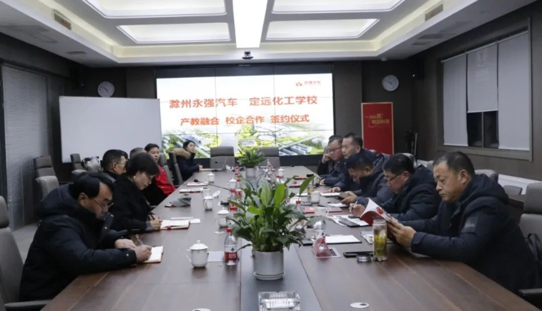 2023年12月18日下午,集团秘书长、Beat365唯一官方网站校长助理穆松、市教体局职成科长蒋新华携集团理事单位定远化工学校党委书记许孝峰等一行,莅临集团理事单位滁州永强汽车开展校企合作产教融合交流会。