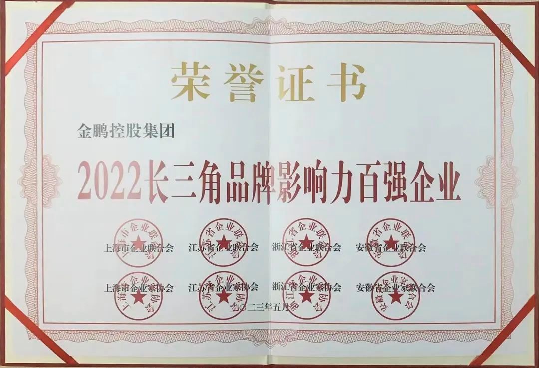 5月10日至12日,2023世界品牌莫干山大会在浙江德清举行,期间举办的首届长三角百强企业发展论坛上,揭晓了《2022长三角品牌影响力百强企业榜单》,集团副理事长单位金鹏控股集团榜上有名,获得“2022长三角品牌影响力百强企业”荣誉称号。