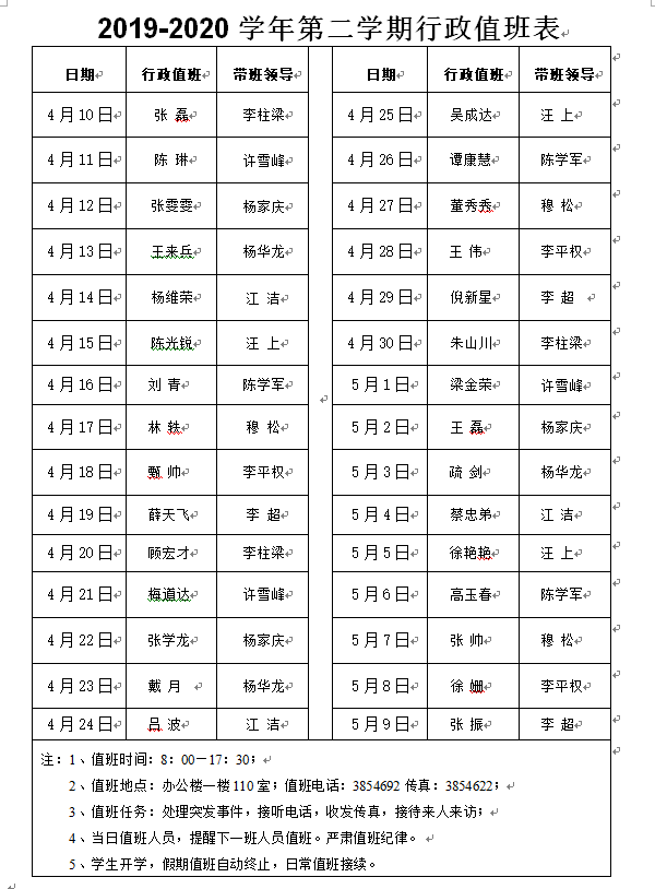 鉴于开学推迟和疫情防控工作需要,根据学校的实际情况,现将下一阶段(4月10日--5月9日)学校行政值班工作安排如下(见附表),请各位领导和值班同志认真遵照执行。
