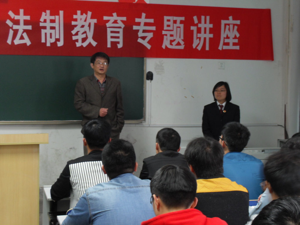 2014年4月23日,学院保卫处邀请了滁州市琅琊区人民检察院孙丽亚检察官来院给机电工程系的师生做法制专题讲座。孙检察官用自己多年来的工作经验和丰富的法律知识,列举了许多学生犯罪的真实案例,给学生进行深情的宣讲,使同学们既学到了法律知识,又增强了法制意识,提高了自我保护的能力。