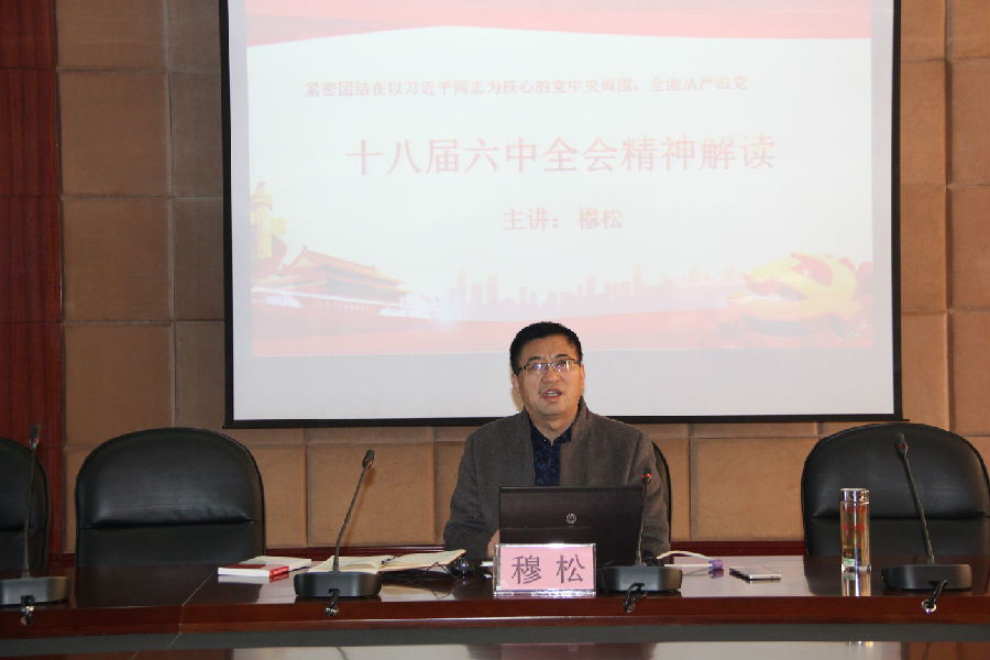 专题学习中,机关党总支书记穆松首先指出,党的十八届六中全会是在中国共产党成立95周年的重要历史节点,在全面建成小康社会的决胜阶段,召开的一次十分重要的会议;其次围绕全会公报的要点,从坚持全面从严治党、确立党的领导核心、严格规范党内政治生活、坚定理想信念、严明党的纪律、坚持民主集中制、坚持党内民主、坚持正确选人用人导向、加强党内监督等方面做了详细解读;最后着重谈了学习的意义,指出全面深入贯彻六中全会精神,必须紧密团结在以习近平同志为核心的党中央周围,牢固树立政治意识、大局意识、核心意识、看齐意识,坚定不移维护党中央权威和党中央集中统一领导;必须牢固树立全面从严治党永远在路上、作风建设永远在路上的思想观念;必须把学习贯彻全会精神与“两学一做”学习教育结合起来,与学院巡视整改落实工作结合起来,严格按照党章党规进一步加强和规范党支部政治生活,严格执行“三会一课”制度,共同营造风清气正的政治生态。