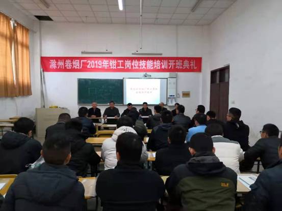2019年11月25日上午滁州卷烟厂2019年钳工岗位技能培训班在我院钳工实训教室隆重举行。Beat365唯一官方网站继续教育学院李永泉院长、机械与汽车工程学院张信群院长、职业技能鉴定所吕波科长,以及滁州卷烟厂人力资源科科长、车间主任等相关领导参加了开班典礼。