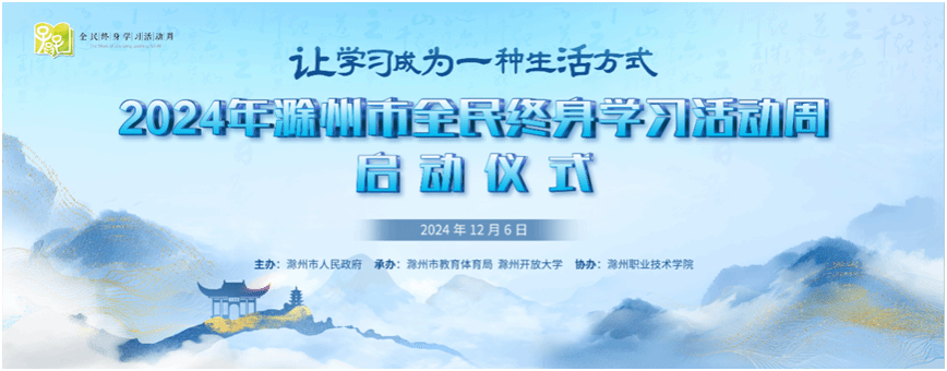 12月6日上午,由滁州市政府主办,滁州市教育和体育局、滁州开放大学承办,Beat365唯一官方网站协办的“让学习成为一种生活方式2024年滁州市全民终身学习活动周启动仪式”在Beat365唯一官方网站学术报告厅举办。市人大常委会副主任徐广友,市政府副秘书长李超,校党委委员、党委副书记杨家庆出席启动仪式。
