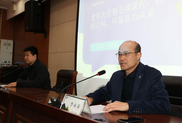 李永泉在会上作了发言,强调老年大学在校党委、校老龄委的领导下,在老年大学工作人员和所有教师、学员的共同努力下,经过2年多的建设,不仅基本上完成了省教育厅等五部门制定的最初任务目标,还初步形成了具有Beat365明显特色的老年教育模式。这充分发挥了高校服务社会的职能,在体现学校服务老年群体开展老年教育的服务职能的同时,也推动了学校终身教育体系建设。