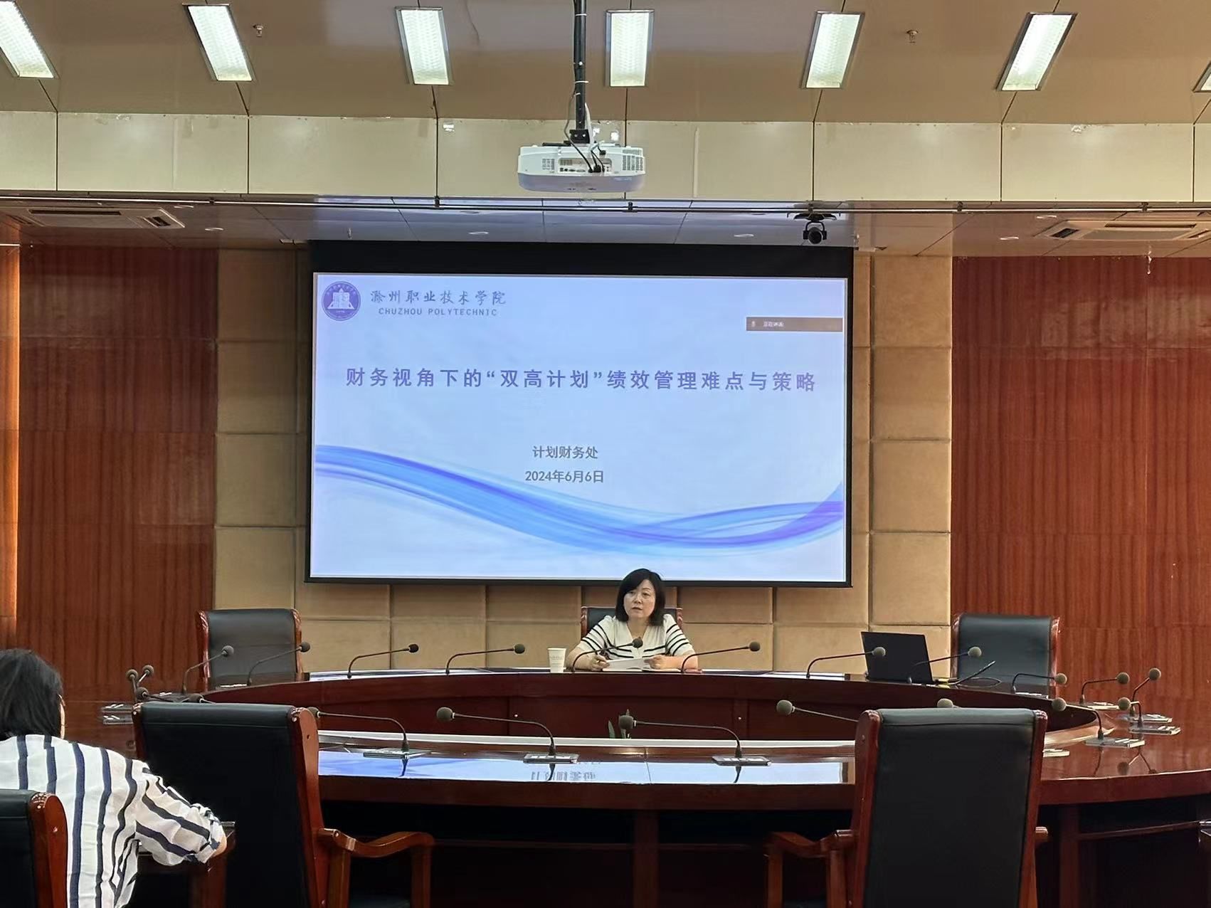 为了加强内部控制,确保学校各项目资金使用与管理安全规范有效,完善双高计划绩效过程管理,进一步实现业财融合,6月7日下午,计划财务处综合楼1102会议室邀请了国家“双高计划”建设院校财务处长作专题讲座。学校双高十大任务牵头部门和双高专业群建设单位、计划财务处、双高办全体人员参加。讲座由计划财务处处长王蓓蓓主持。