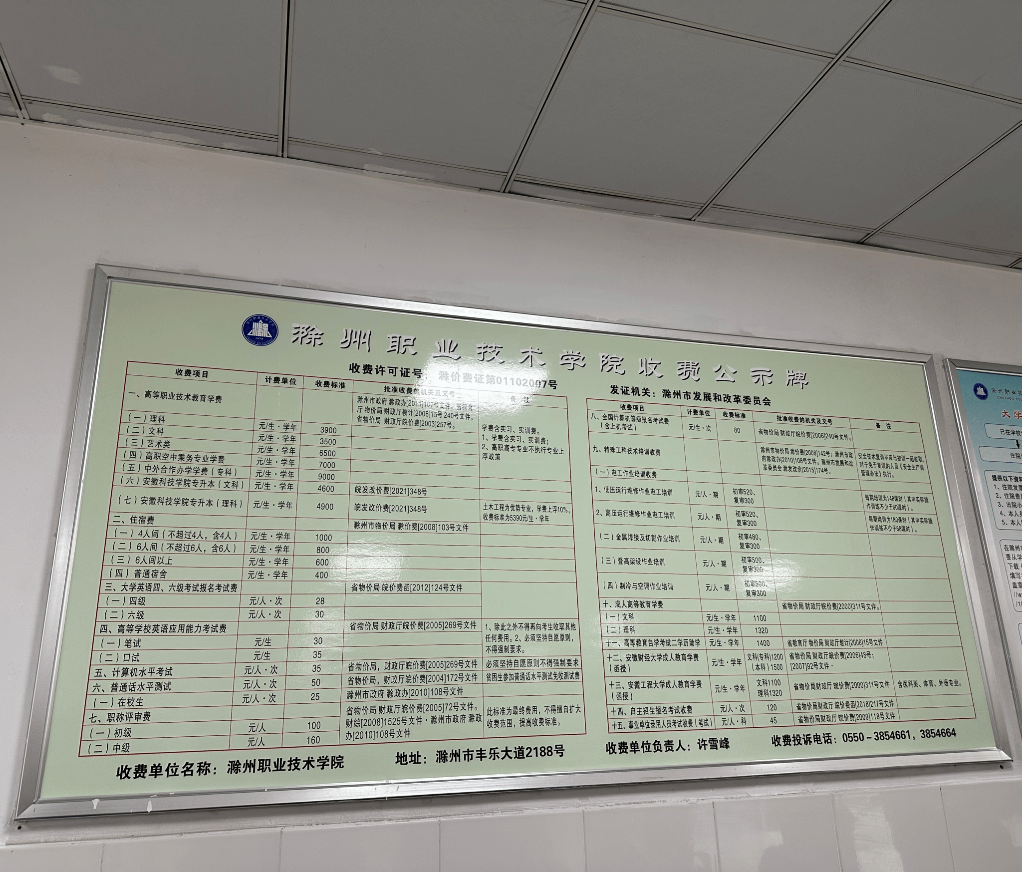 计划财务处严格执行皖价费[2006]240 号、教计[2006]15号文件执行、皖价费[2003]257号、皖发改价费〔2021〕348号等文件,在收费现场设立了收费项目、标准公示牌,让新生了解各项费用明细,并在现场设立了咨询处,公布了咨询电话,针对新生提出的各类疑问,给予详细耐心的解答。