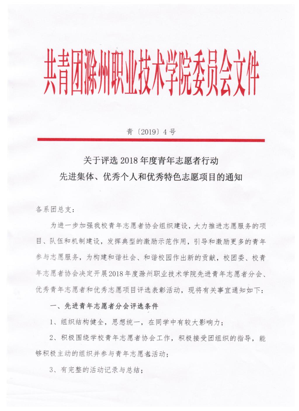 201904关于评选2018年度青年志愿者行动先进集体、优秀个人和特色志愿项目的通知