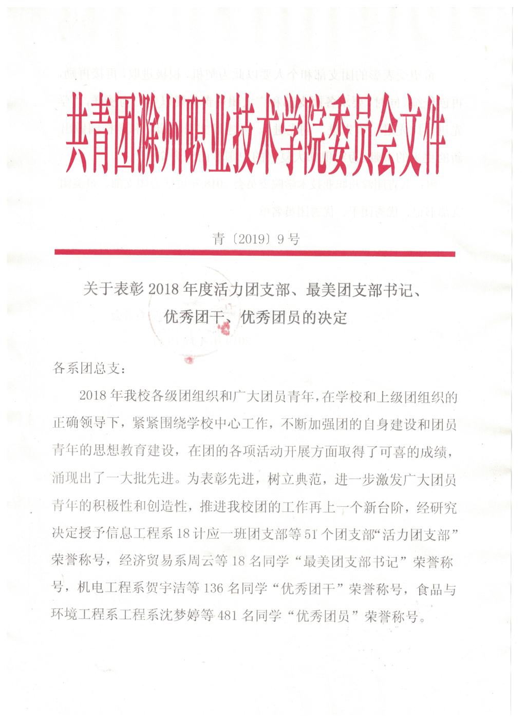 201909 关于表彰2018年度活力团支部、最美团支部书记、优秀团干、优秀团员的决定
