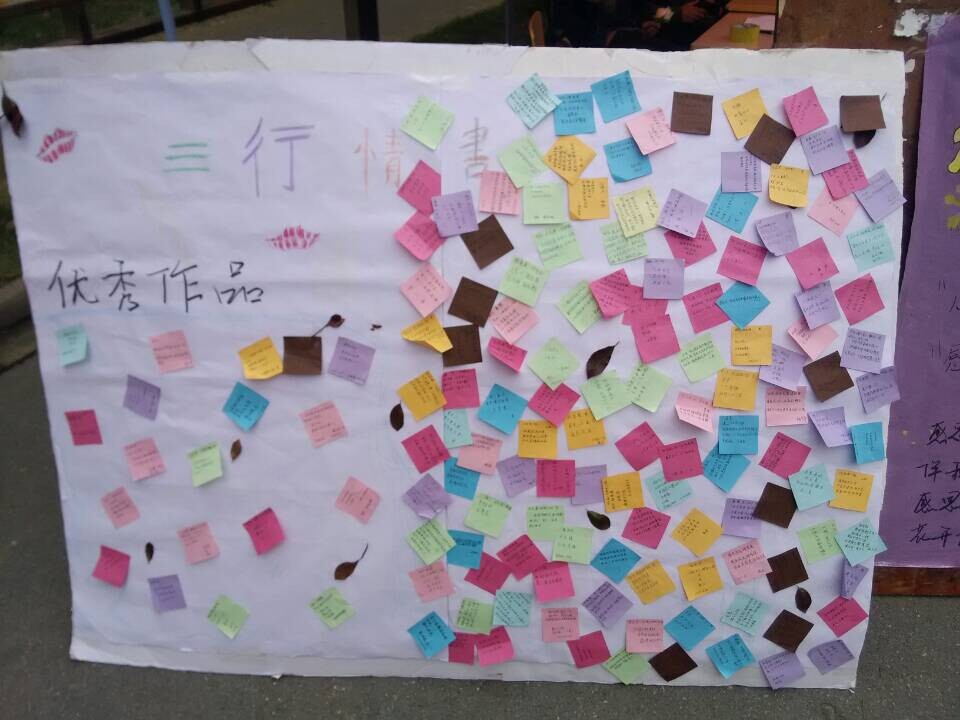 本次活动在男生宿舍楼下进行了现场宣传,在同学们当中引起了热烈的反响,活动也得到了广大老师和同学们的大力支持。本次活动围绕“亲情”、“友情”、“爱情”三个主题展开,征文阶段共持续了3天,共收到卡片300多张。其中不乏一些感人至深、文采斐然的佳作,如朱瑶瑶同学、和郭浩同学的三行情书为代表,耐人寻味、引人深思。部分优秀作品已经在女生宿舍楼1号楼下展出,其余的作品也都全部展示出来。
