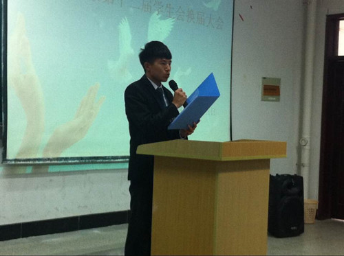 大会在第十一届团总支优秀干部代表陶赛、学生会优秀干部代表常志鑫的致辞中拉开了帷幕,他们在台上分享了他们在团总支、学生会取得的收获并表达了对系部团总支、学生会的祝愿。接下来进入了本次大会的高潮,参与竞选的人员做竞选演讲。他们分别就自己对团总支、学生会的认识,以及在过去工作中取得的优异成绩,对未来工作的展望等方面做出了激情的演讲。经贸系第十一届团总支副书记葛雪雪、学生会副主席常志鑫对团总支、学生会上一年工作进行汇报,并希望在以后的工作中,团总支、学生会新一届成员要紧跟党的步伐,以身作则,严格要求自己,起到模范带头作用,积极配合各部门展开工作,充分发挥纽带作用,为系部发展建设尽自己的一份力。