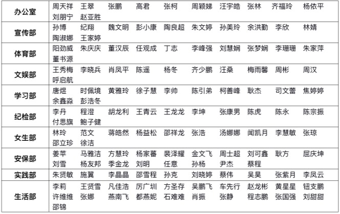 本次招新工作本着“公开、公平、公正”和“择优录用”的原则,对每一位报名的同学都进行了认真、细致的考察。通过资料审核、笔试、面试、等方式进行选拔,最终共选拔出100余名学生干部,并开始为期两个月的考核。(录取名单见下表1-1)