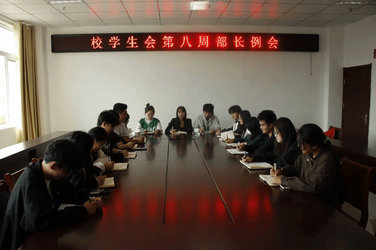 2023年10月16日中午12点,校学生会在大学生活动中心317召开了本学期第八次部长例会,本次例会由主席团成员孟婉婷主持,主席团王辉、都燕及各部门部长参加。