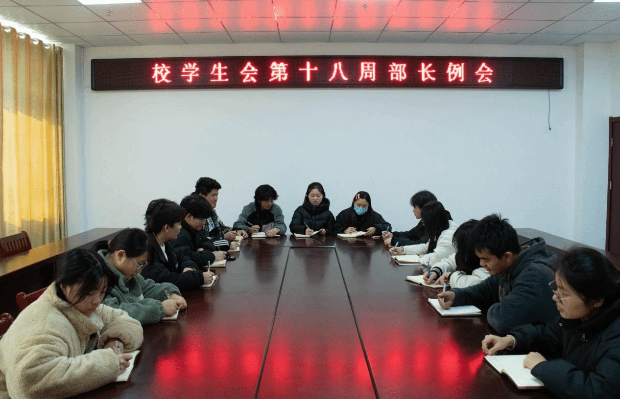 为确保学生会各部门工作的顺利进行,明确各部门近期的工作任务,于12月25日中午12点在大学生活动中心318会议室召开第十八周部长例会,本次例会由校学生会主席团成员及各部门部长参加。