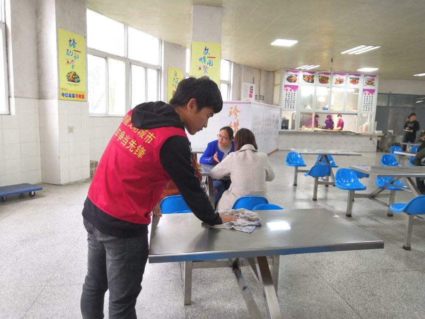 志愿者们先在食堂阿姨那里了解食堂师傅每餐工作内容,并请师傅讲授相关工作技巧。随后根据工作需要分为两组,一组负责分拣筷子,为用餐的同学提供便利。一组负责擦桌子,将饭桌上的饭粒、残渣回收到饭堂,为下一位吃饭的同学提供干净的桌椅。中午是食堂人最多的时候,志愿者们充分发挥了他们的作用,协助工作人员清理餐桌,清理地板上的污水,给就餐的同学们营造一个良好的就餐环境。志愿者们没有嫌弃剩饭剩菜的异味,没有躲避脏活累活,一直持续到食堂内用餐的同学全部离开。活动接近尾声时,食堂阿姨热心的问候志愿者们,并对志愿者们表示感谢。