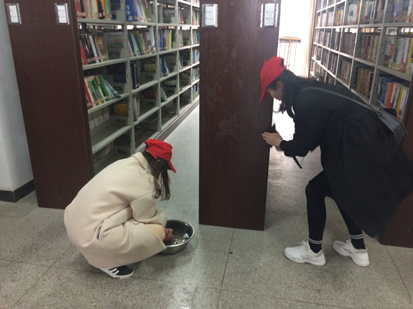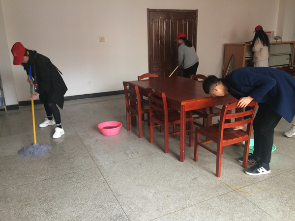 志愿者自带抹布、桶、盆、扫帚、簸箕、拖把等工具按时来到图书馆二、三层楼进行卫生打扫。活动一开始,志愿者们分工明确,将书橱的各个角落无一遗漏的擦干净。把地面清扫干净之后,用拖把都拖一遍,并洗干净抹布开始擦桌子、柜子、书架、玻璃以及门窗。在服务活动过程中,志愿者们始终保持安静,自觉维护图书馆良好读书氛围,有条不紊地整理书籍,并把书本按类别归类。