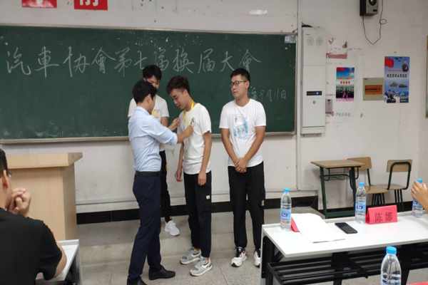 大会伊始,主持人介绍到场嘉宾,在一片热烈的掌声中,汽车协会会长刘天元做述职报告,同时宣布下一届负责人名单,并由汽车协会新任会长聂合飞,副会长圣家春、张志伟作就职报告以及工作展望。接着,汽车协会指导老师何凯上台致辞,同时为新一届负责人带上新一届的工作牌,细数了汽车协会获得的荣誉,肯定了上一届汽车协会负责人兢兢业业的工作态度并表示感谢,同时勉励新一届的负责人继续把汽车协会发展的更好,不要辜负老会长的期望。