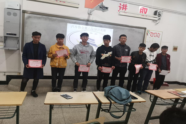 在主持人的精彩解说后大家开始了积极的抢答,台下观众掌声不断,赛场气氛热情高涨,使活动有声有色地进行着。在激烈的争夺中,只剩下四支队伍进入到终级PK,大家都在思考着答案,当主持人一声令下大家都纷纷开始抢答,第一轮环节下来第三组选手占上风。本次活动的举办拓展了学生的专业知识面,提高了自身专业知识水平,营造浓厚的学习氛围,创建优良的学风。选手依次按照比赛流程进行答题,经过1个多小时的激烈角逐,最终19级新能源二班的朱致远同学以微弱的优势获得了一等奖。同时,19级机制班的王新礼同学获得了二等奖,汽车协会的余学远同学获得了三等奖,还有几位同学获得了优秀奖。