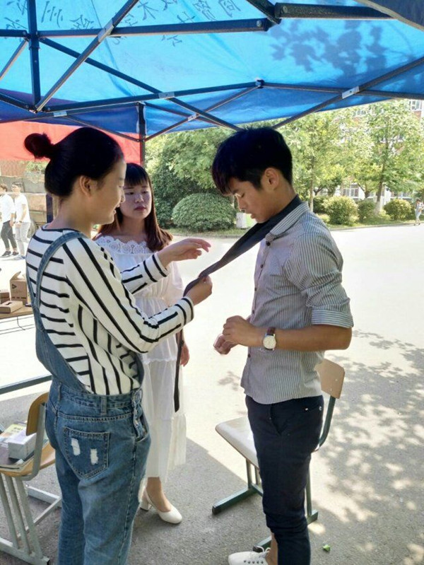 活动在1号宿舍楼下进行,商贸协会人员讲解领带对同学们的重要性并现场教大家如何打领带。同学们在认真学习之后都想检验一下自己的学习成果,同学们就相互打起领带来。这样不仅能找出自身在打领带方面的不足,还能学习对方的优点,自己加强练习并能提高熟练度。