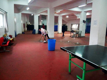 乒协志愿者们在会长张玲的指挥下,有序的展开工作,首先将校园车棚内的车辆进行整理,对乱停车的同学进行劝阻。之后对乒乓球室进行彻底的清理。志愿者们分工明确,满怀热情,把乒乓球桌子细细的擦拭,平时没有打扫到的死角也被清理干净。在志愿者们辛勤的劳动下,球室也有了一个崭新的面貌,看着干净的球室,志愿者们脸上露出了满意的微笑。