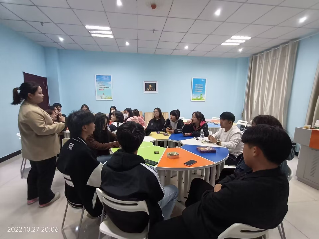 10月27号早上,为促进社团各部门的交流,对社团人员进行素质训练。未来企业家协会与心理协会带领着各社团成员在心理协会活动室进行联谊活动。
