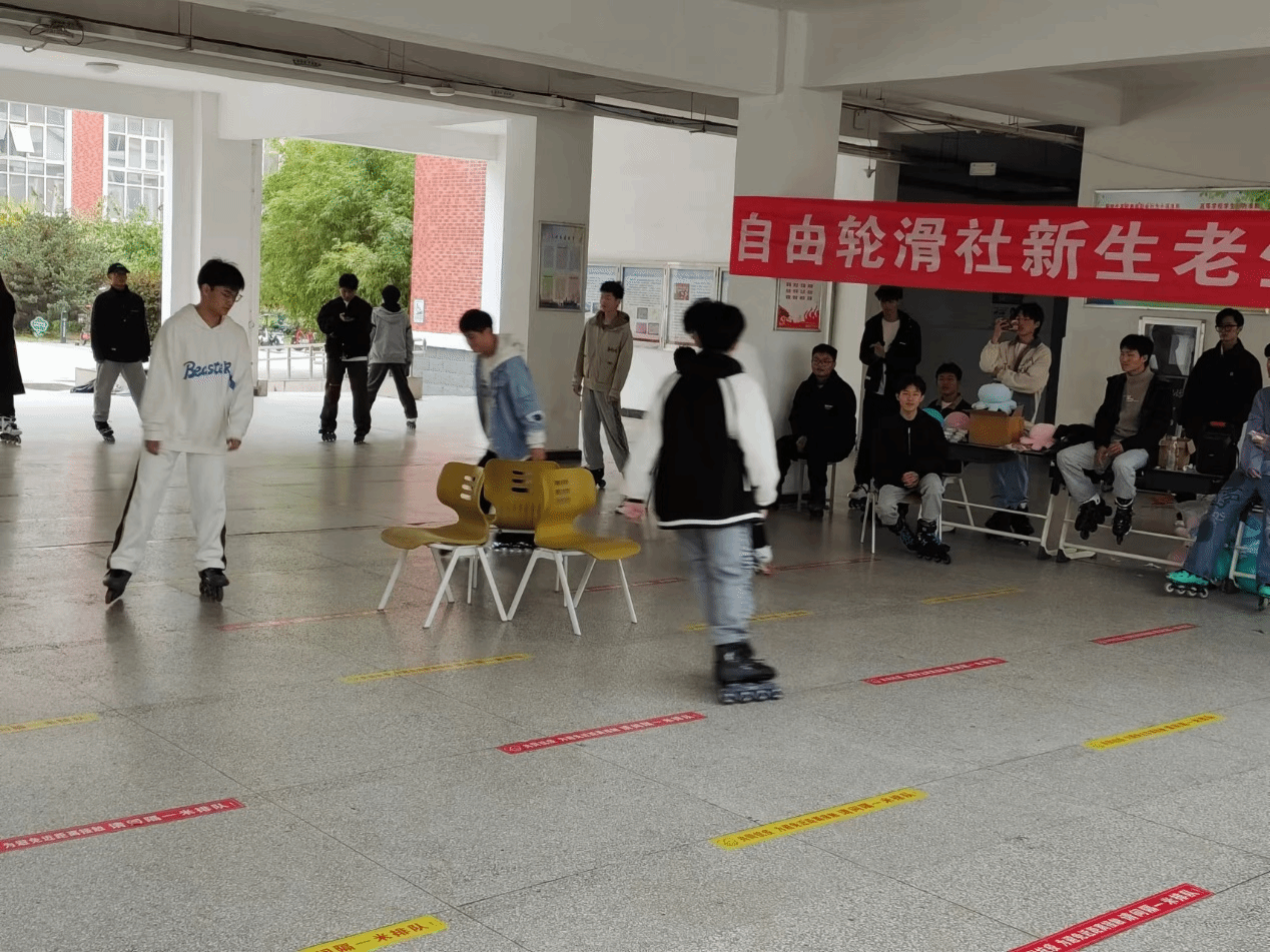 活动开始之前,社团干部准备好了桌子、板凳和音响等设备,轮滑爱好者们也带着自己的装备陆续到场。