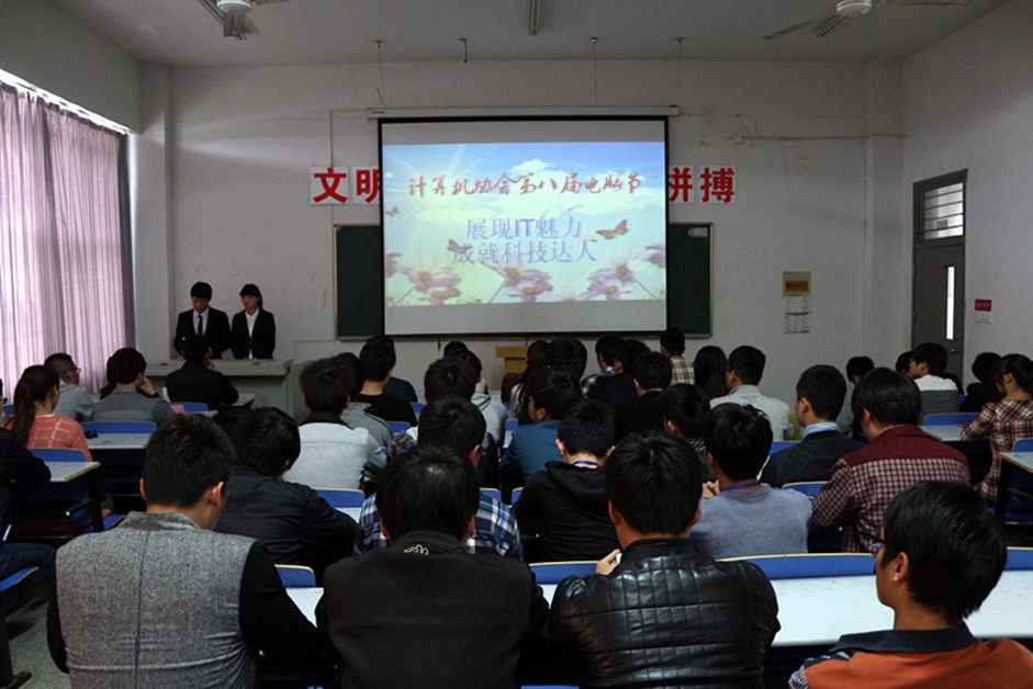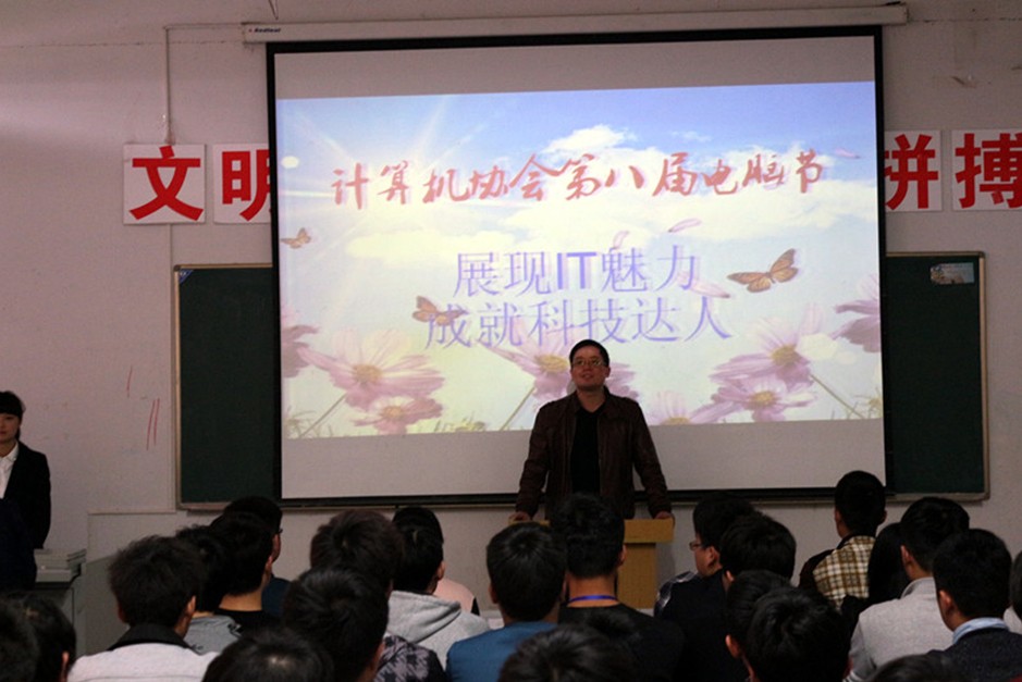 4月23日下午1点,我院计算机协会第八届电脑节开幕式在2111多媒体教室正式举行。本届电脑节以“展现IT魅力,成就科技达人”为主题,鼓励学生积极参加社团文化活动,通过举办一系列丰富多彩、健康向上的活动内容,展现出我院大学生良好的精神文明风貌。参加本次开幕式嘉宾的有:信息工程系团总支书记杨阳、教务处王来兵老师、滁州学院计算机协会会长王明金、信息工程系学生干部、社联主席王涛、以及各社团负责人。本次开幕式特邀广播站罗文豪、宋婉茹主持。