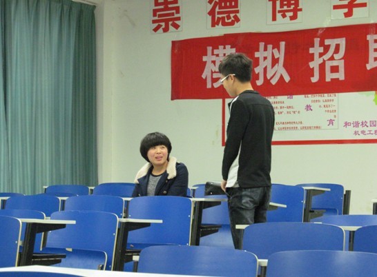 经过激烈的初赛后共有30名选手进入决赛,11月10日下午2:00决赛在5103拉开了帷幕。决赛现场的“向陌生人要手机号”以及“掉落的垃圾”等 各样的小情景还原了一场生动精彩的模拟招聘会。