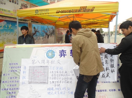 为庆祝奕轩棋社成立八周年,同时也为了丰富同学们的课余文化生活,2013年3月30日,奕轩棋社在一号女生宿舍楼下面向全院学生开展了院内五子棋比赛。整个活动持续了一天,选手们在小小的棋盘上斗智斗勇,争锋相对。比赛进行至白热化阶段。参赛选手就比赛竞争性并不给予过度的关注,以下棋为主,以乐为目的,友谊第一,比赛第二。