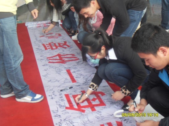 5月8日清晨,我院社团联合会将预先准备好的帐篷、海报、条幅等一系列宣传物品,摆放到我院老食堂北门做红会宣传,社联志愿者为来往的同学讲解“博爱、人道、奉献”的红十字精神,并请同学到条幅上签字,让同学们进一步了解红会、充分认识红会。