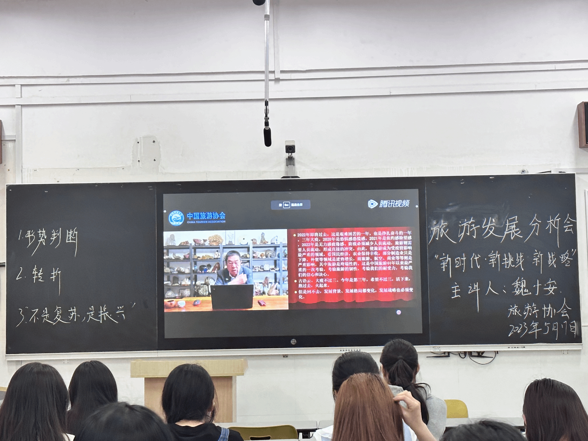 本次活动组织同学们观看中国旅游协会“大家开讲”直播回放,由世界旅游城市联合会首席专家魏小安老师从“新时代、新挑战、新战略”等角度来分析当今旅游业的发展与复兴。观影过程中,同学们积极踊跃,互动热烈,纷纷表示受益匪浅,营造了一种轻松愉悦的交流氛围。