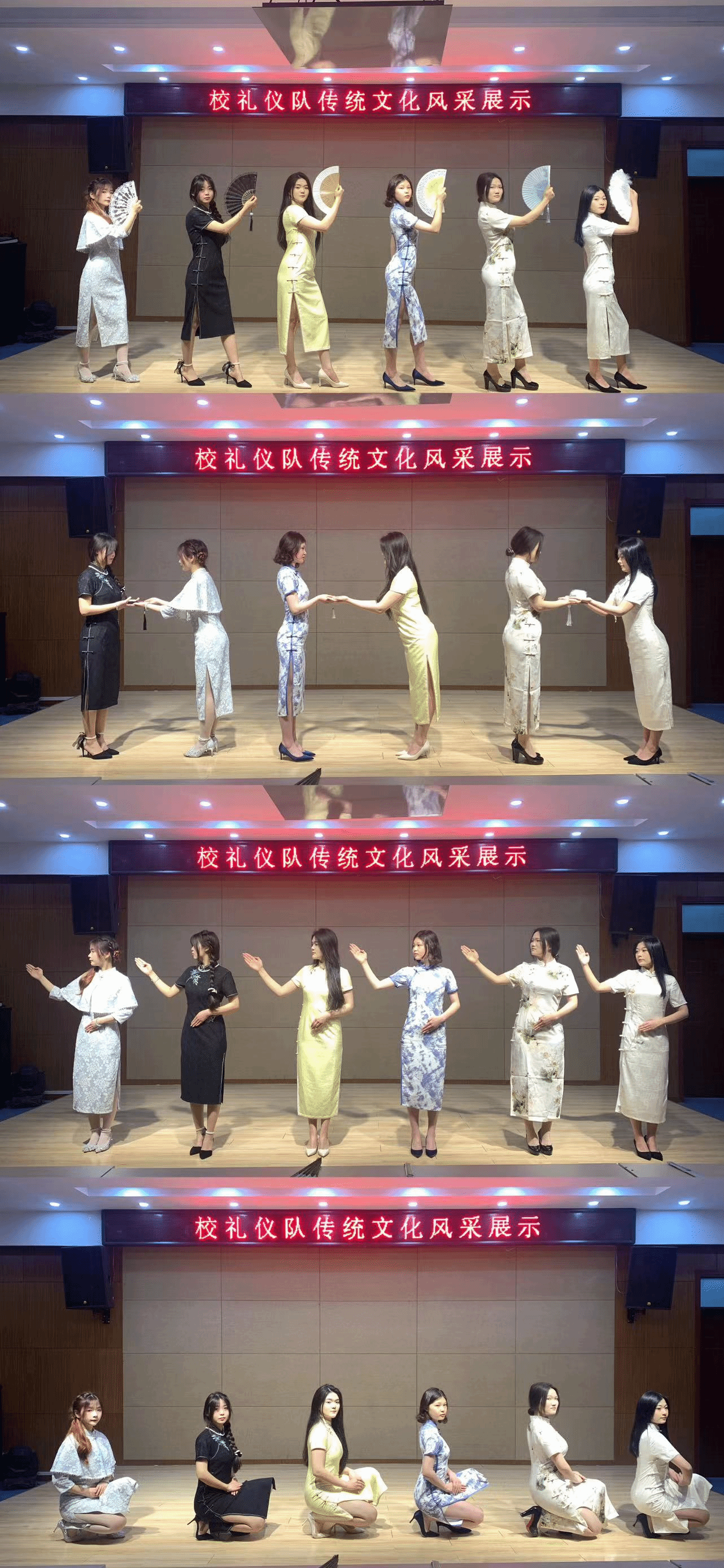 活动中,礼仪队同学身着精美旗袍信步而来,旗袍不仅是一个名词,它更是中国传统文化底蕴,被称为“女性国服”。站在舞台上,同学们以歌曲《西楼别序》展示着中华礼仪之美。同时体验身着传统服饰所带给我们的荣誉感。