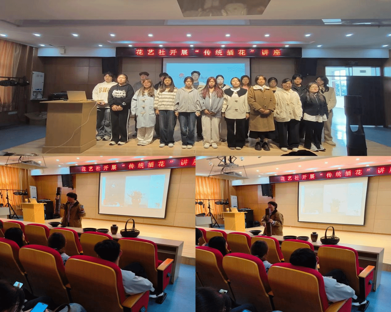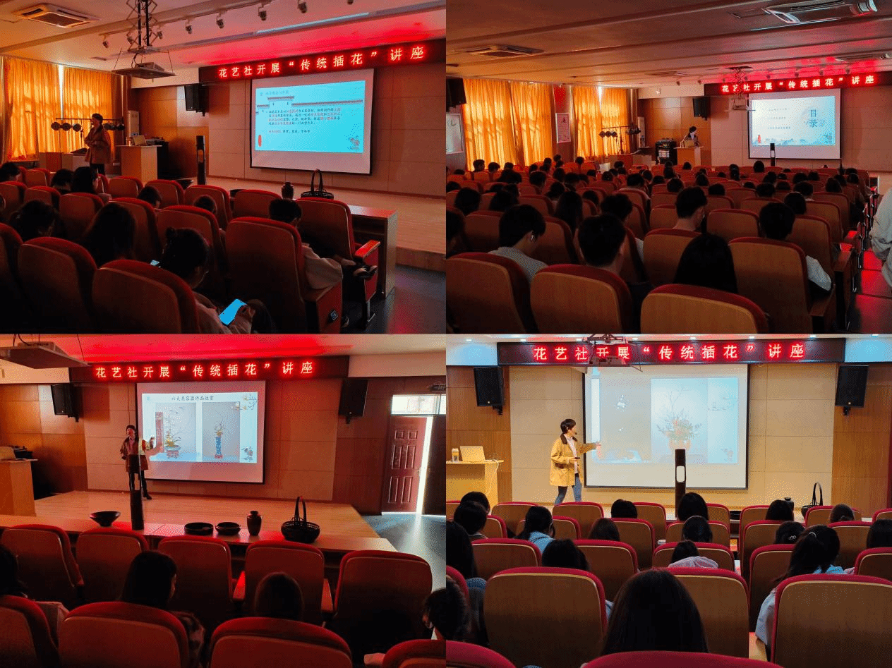讲座伊始,花艺社指导老师贾雪晴首先为大家详细阐述了传统插花的历史渊源。从古老东方文化中插花艺术的萌芽,到历经各个朝代发展演变,再到其在现代社会依然闪耀的独特魅力,老师生动的讲述仿佛带领大家穿越时空,领略了传统插花一路走来的光辉历程。在风格特点的讲解部分,贾老师通过展示大量精美的插花作品图片,深入浅出地分析了不同风格传统插花的特色。无论是线条优美、注重意境营造的东方式插花,还是色彩绚烂、丰满华丽的西方式插花,每一种风格都让同学们大开眼界。