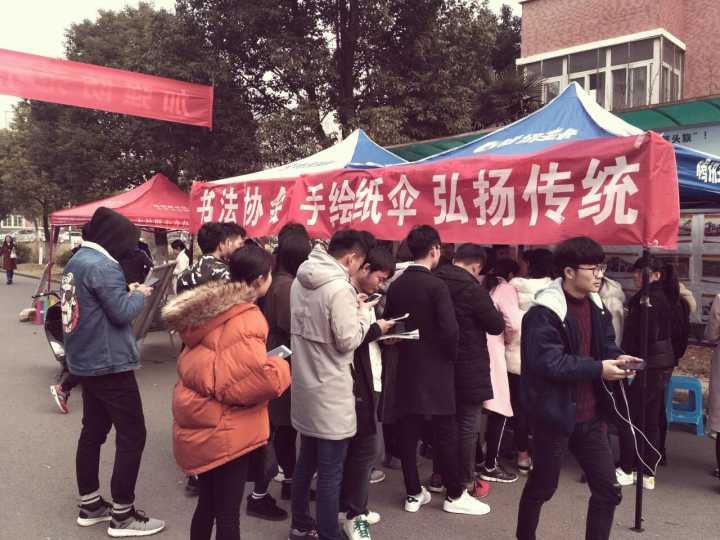 “弘扬传统文化守护国粹”,2017年12月4日院书法协会在女生宿舍1号楼开展手绘纸伞,弘扬传统的活动,采取积攒和义捐的方式送手绘纸伞。院书协全体成员在摊点为前来参与活动的同学服务。