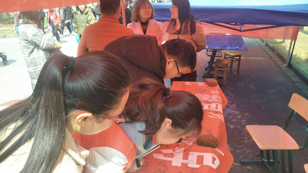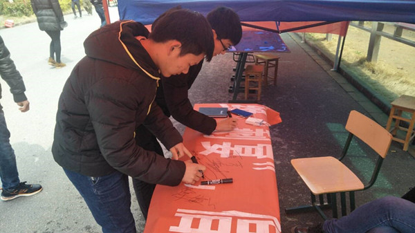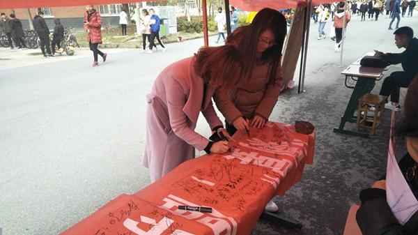 食品营养社社员们在校园里设立摊点,为同学和老师们宣传光盘行动,同学们为响应活动理念纷纷在我们的宣传横幅上签字留念。食品营养社的指导老师也为我们这次的活动,也在横幅上签字留念。