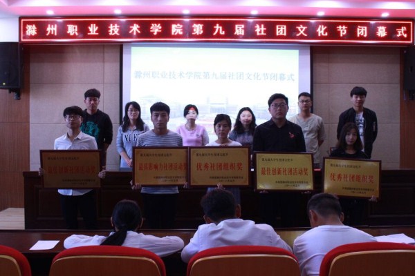 首先由社联主席褚志康对本次社团文化节作出总结,简单介绍了此次活动参与社团的情况,希望能够更好地发挥社团本身特色,让社团联有更好的发展。之后,程诚副书记为此次文化节活动情况作出点评,希望各社团、社联继续认真开展工作,争取更大的进步,把我院学生社团工作提升到更高的台阶,并宣读了《关于表彰第九届社团文化节优秀集体和个人的决定》文件。在本次社团文化节中广播站获得“最具影响力社团活动奖”,民乐坊和蓝尘剧院获得“创意社团活动奖”,心理协会和书法协会获得“优秀社团组织奖”。紧接着由广播站副站长黄会杨代表社团发言,他介绍了在本次社团文化节中广播站的活动开展情况,总结了不足。并表示会在未来加强于其他社团的沟通、交流,共同助力校园文化建设。接着团委老师为他们颁奖并合影留念。之后为同学们播放了文化节社团活动视频,更全面的了解了各个社团的风采。最后由王书记宣布本次社团文化节圆满落幕。各组织代表、社联工作人员、社团代表上台与领导进行了合影留念。