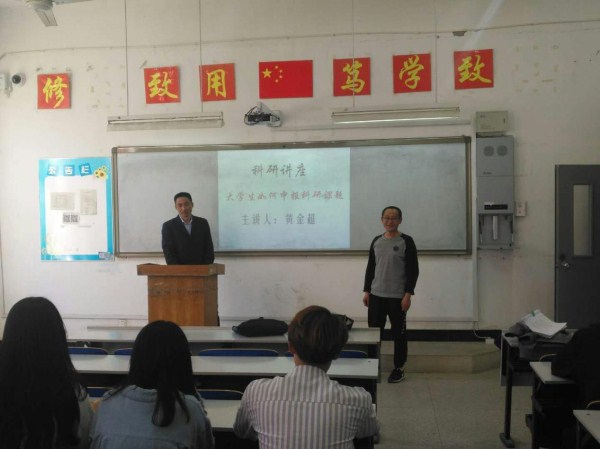 为调动我院大学生申报科研课题的积极性,提升大学生的科研素养,5月9日下午,黄金超副教授在4107教室为数学爱好者协会学生举办了《大学生如何申报科研课题》的讲座。讲座由协会指导老师郭栋主持、数学爱好者协会全体学生和其他对科研感兴趣的同学参加了此次讲座。