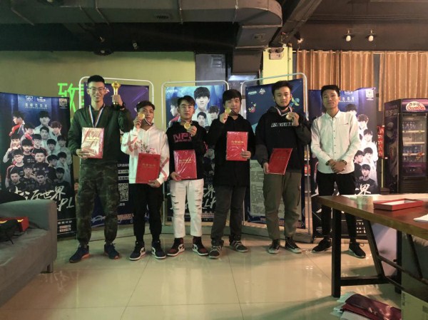 比赛于11月3日上午10点正式在致青春网咖开打,比赛过程中同学们热情高涨,人声鼎沸。最终经过3个小时的激烈角逐诞生了冠亚季战队。比赛结束后由胡刚上台给冠亚季颁奖并合影留念。