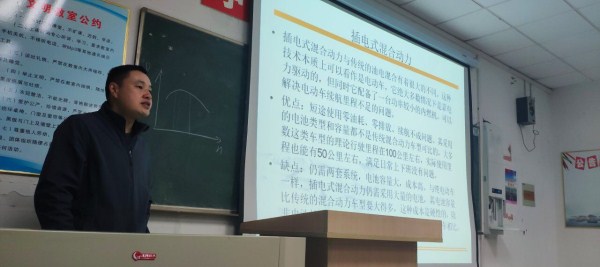 讲座中,贾会星老师结合当今汽车发展趋势,详细的介绍了新能源汽车——按照使用能源的来源划分,新能源汽车的技术可分为五类。一是基于传统石油燃料的节能环保汽车,如先进柴油车和混合动力汽车。二是基于天然气和石油伴生品的燃气汽车。三是料电池、氢动力汽车四是纯电动汽车。五是太阳能动力汽车等众多新能源汽车技术和知识。