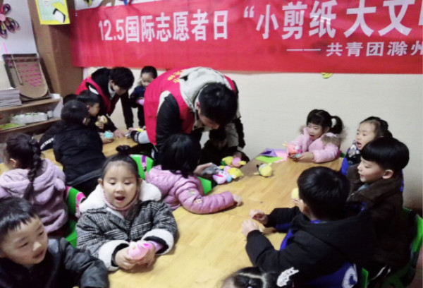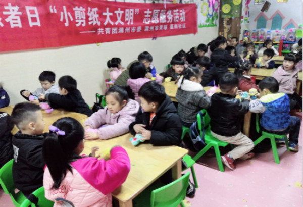 12月5日国际志愿者日,Beat365红韵镂艺社社员携同社区党群心连心志愿服务队志愿者走进东环幼儿园开展“小剪纸,大文明”志愿活动。