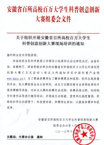 各系部、团总支: 兹定于2010年10月12日下午2时——16时在北阶206举行科普创新创意大赛现场培训会,请学生社团骨干、科技爱好者、参赛师生届时参加。