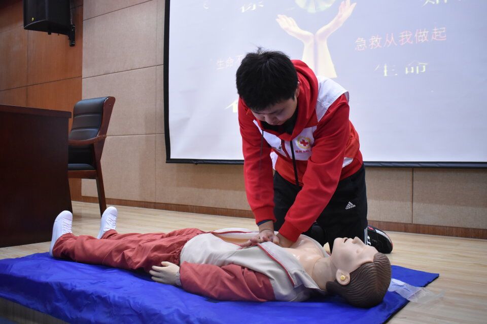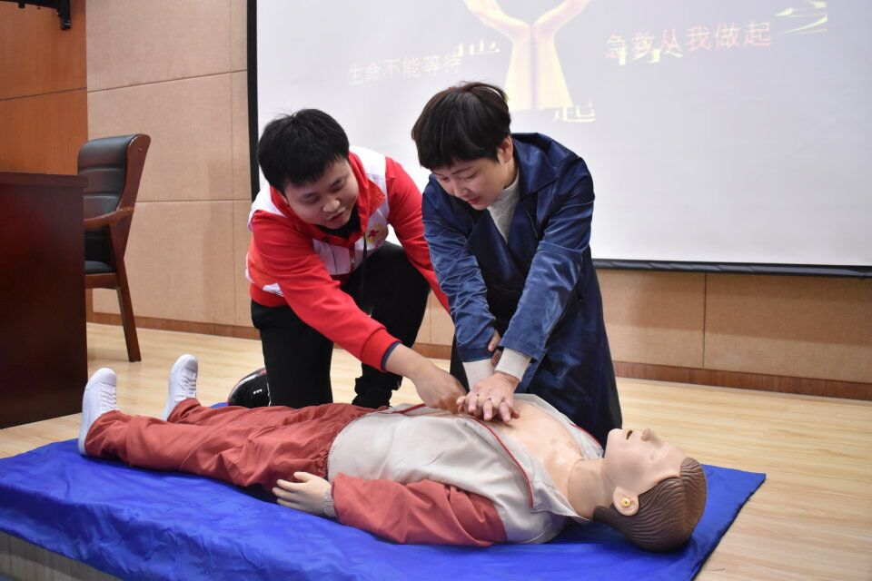 培训期间,李敏和王永达两位讲师为参训教师详细讲解了现场救护的特点、目的意义以及现场救护的程序;采用PPT、模拟现场互动等方式,围绕CPR现场紧急救护知识、常见慢性病(高血压等)的预防及改善,进行了精彩的讲解和演示,阐述了心肺复苏的操作步骤、人工呼吸与胸外心脏按压的基本要点,溺水的救援方式、注意事项,中暑的症状和处置方法等理论知识,并现场演示了心肺复苏的标准操作步骤与方法;通过互动和模拟实操,就心肺复苏、创伤止血包扎处理等进行了现场指导,有效提高了参训教师应急救护的能力。
