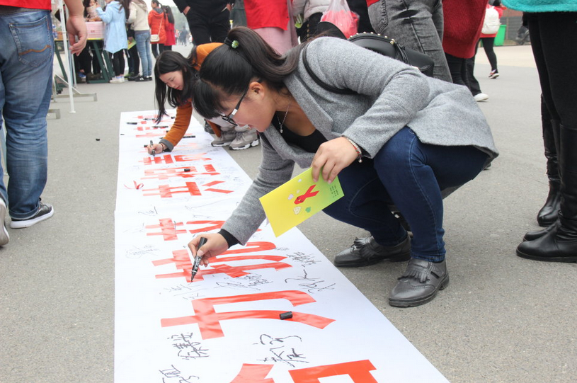当天下午,我院红十字会在女生宿舍一号楼下举办了签名防治艾滋、展板巡展、悬挂横幅、发放宣传手册、佩戴红丝带等活动,在校内向广大学生宣传艾滋病防治的有关知识。