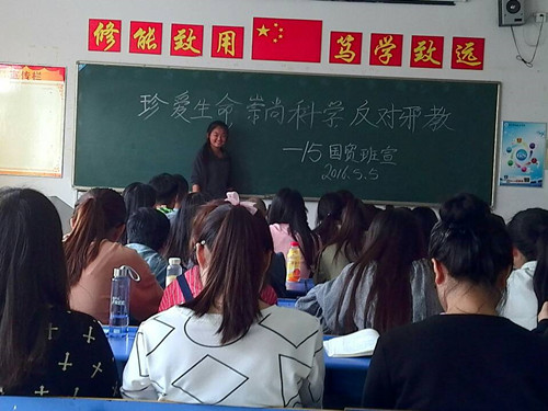 为了使广大学生进一步提高识别、抵御和有效防范邪教的能力,培养学生正确的世界观、人生观。2016年5月12日,经济贸易系团总支、学生会组织各班级团支部开展了红十字会系列活动之“反对邪教,珍爱生命,崇尚科学”主题班会。