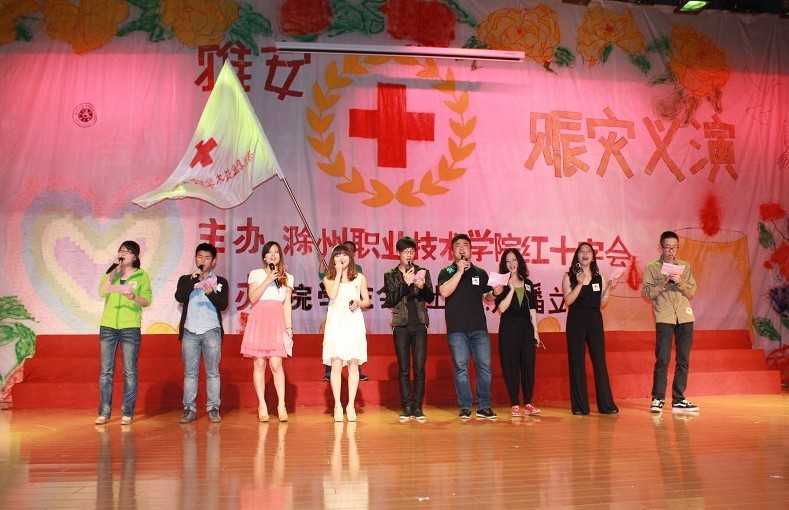“我和你一样,一样的坚强,一样的全力以赴追逐我的梦想”——由院红十字会主办、院学生会、社团联合会、广播站协办的“为雅安加油”纪念五八世界红十字日赈灾义演晚会于5月8日下午2点和晚上7点在我院大楼报告厅分两场举行。学院党委委员、副院长、院红十字会会长吴大明、南谯团区委书记张伟、南谯团区委副书记戴莺、琅琊团区委副书记施成虎、院学生处副处长温江涛、张军、院思政部副主任李爱红、院团委副书记刘杰、程诚及各系部团总支书记出席此次活动。院红十字会会长吴大明代表学院红十字会致辞。