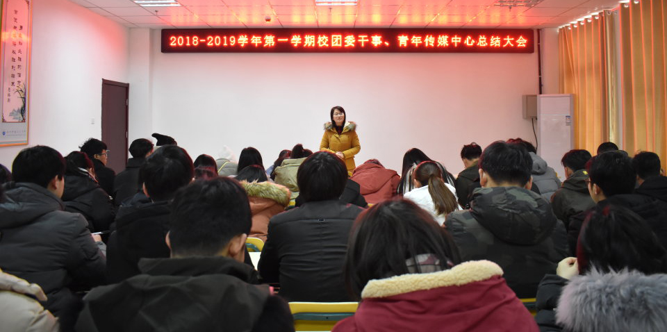 为总结本学期工作状况,1月3日,校团委干事、青年传媒中心在大学生活动中心328召开2018-2019学年第一学期期末总结大会,校团委指导老师谭康慧、校团委干事、青年传媒中心全体成员参加了本次会议。