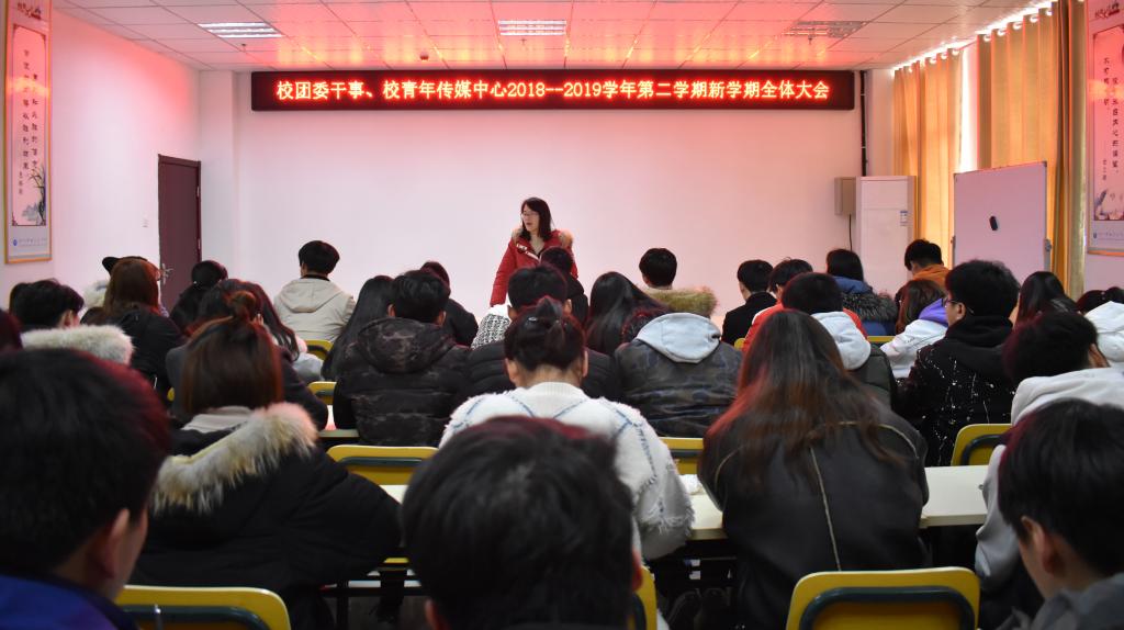 2019年2月25日,校团委干事、校青年传媒中心在大学生活动中心328召开了2018-2019学年第二学期新学期全体大会,参加此次大会的有校团委指导老师谭康慧、校团委干事以及校青年传媒中心全体成员。
