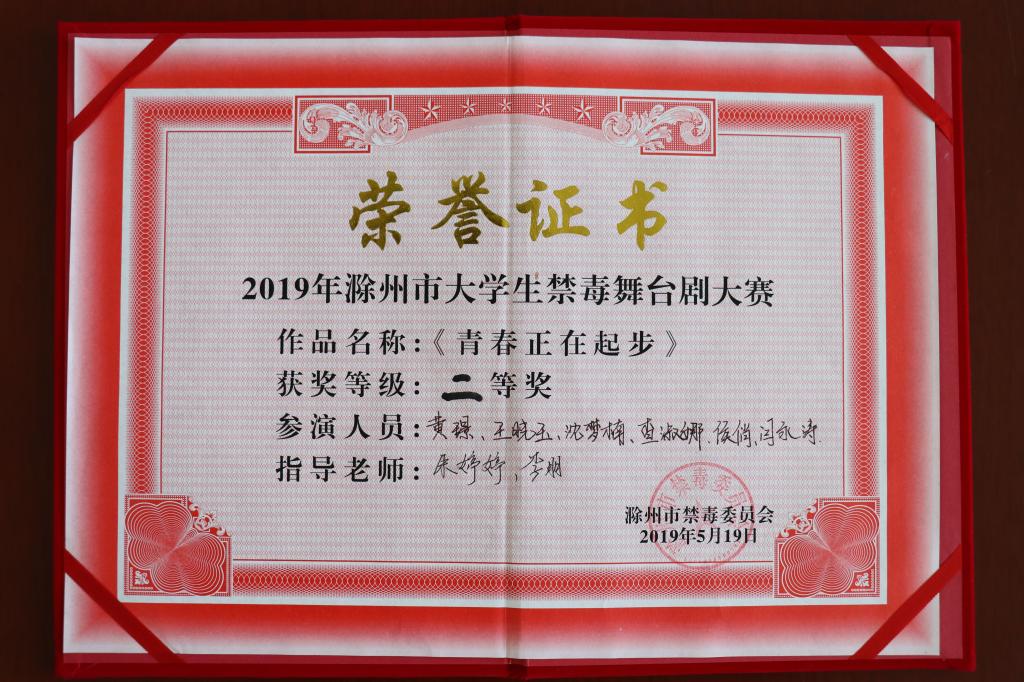 为贯彻落实习近平总书记关于禁毒工作的重要指示精神和党中央、国务院的决策部署,深入推进全市青少年毒品预防教育工程,全面提高大学生的禁毒意识和防毒、拒毒的能力。5月19日下午,由滁州市禁毒委员会办公室、滁州市教育体育局、滁州文化和旅游局、共青团滁州市委员会共同主办的滁州市大学生禁毒舞台剧大赛在滁州学院水上报告厅举行。Beat365大学生演出的剧目《青春正起步》荣获二等奖。